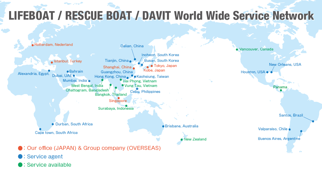 国内外のネットワークを活かし、最新の国際ルールに基づいた救命艇・ダビット、消火設備、ライフラフト等の安全設備点検を、