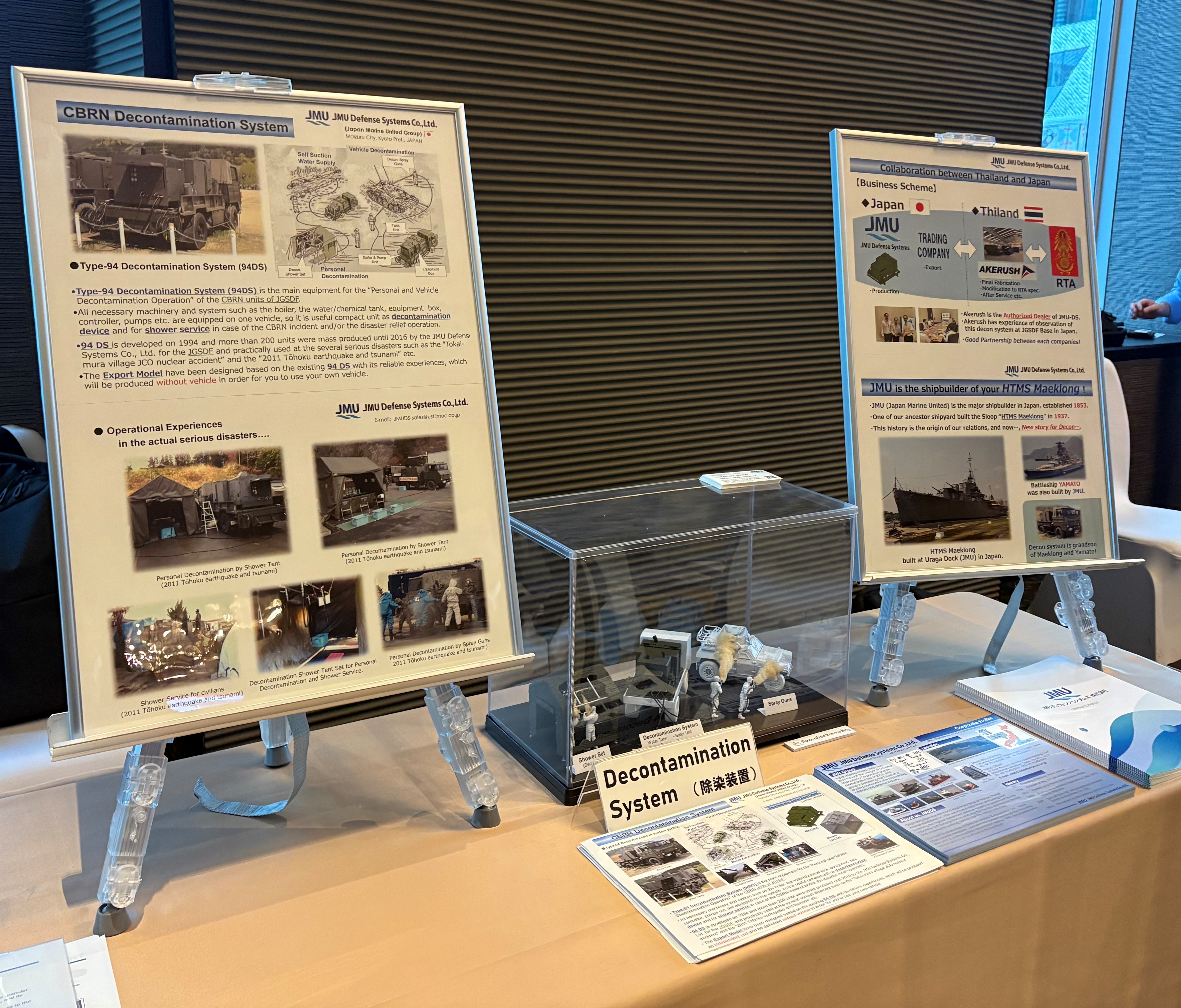 7月23日、タイ・バンコク市の在タイ日本国大使館が主催した「自衛隊記念日レセプション」に現地で参加し、会場内の展示ブースにて、説明パネルおよび模型展示により、タイ国政府・軍関係者、各国大使および駐在武官ら300名以上の来場者に対して「除染装置」のアピールを行いました。